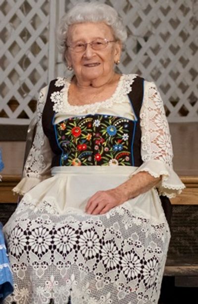 Her faith and her family were the top priorities in her long life. She loved to cook and host dinners for her family, and especially enjoyed baking for them. Everyone knew Oma would bring her delicious kipfel or Apfel Bitte to family events. An avid gardener, she enjoyed growing her own vegetables into her 90’s, and keeping her flower garden blooming. Her secret to reaching 100 was drinking a glass of wine every day! Mary was a founding member of the German Family Society, which originated at St. Bernard’s and eventually moved to Brimfield. In the late 60’s, she used her culinary skills to head up the Ladies’ Auxiliary until the late 80’s, while her late husband, Joseph served as President of the German club. She spent countless hours volunteering in the kitchen, cooking food for events such as the Oktoberfest. She also enjoyed singing with the club’s Harmony Singers.